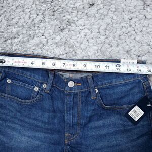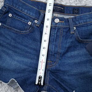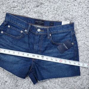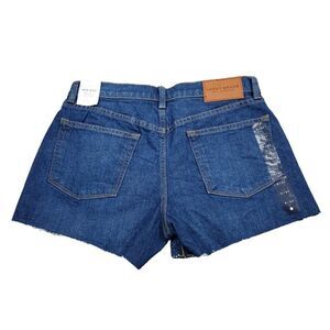 Women's Lucky Brand Mid Rise Cutoff shorts with raw or ripped hem. Dark wash blue stretch denim "Dawn". New with tags. 99% cotton 1% spandex. Style number 7ww1288. Women's size 4 or 27, real measurements shown in photos with shorts laid flat: