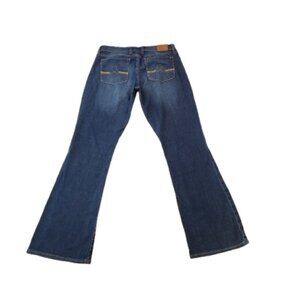 Medium rinse stonewashed bootcut jeans. Mid-rise. Single button and zipper front closure. Whiskering accents. Copper embroidery on back pockets. Sanded detail. Copper hardware. Five pockets.