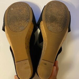 Lucky Brand Miller 2 Cork Wedge Platform Black Linen Strap Sandals 8.5. Slip on, criss-cross linen elastic strap, black side rivet details, fabric upper, cork/rubber sole. Approximate 4" heel with 1.5" platform. Great condition!