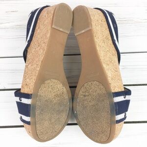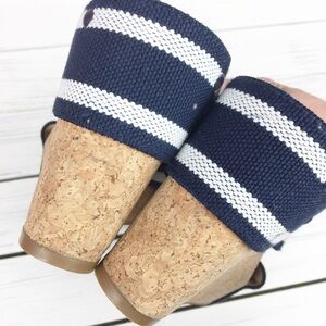 Stylish and comfy. Platform cork wedge style. Wide criss cross strap. Navy stretch fabric canvas. Fabric upper. Manmade lining