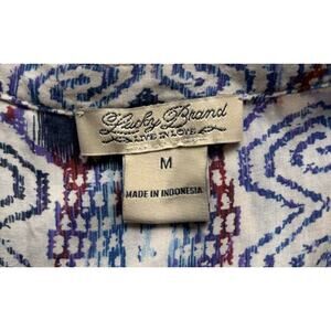 Stylish and easy to wear, this Lucky Brand “Live in Love” women’s top features a colorful abstract design, cap sleeves, front button closure, and a trendy tie at the bottom hem. Lightweight and breathable — perfect for layering or wearing solo. Flattering fit with a casual, boho vibe. Gently worn, in excellent condition with no flaws. Pairs well with jeans, shorts, or skirts for an effortless look with a boho-chic vibe! Great for everyday wear, festivals, or weekend outings. Available in size medium. Material: Rayon 100%. Please see pictures for details and measurements.