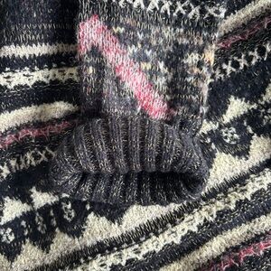 Wool blend (nylon, wool, acrylic) long sweater with two pockets in the front. Gorgeous aztec print throughout give it a nice cabin-side firepit feel. Super cozy sweater.