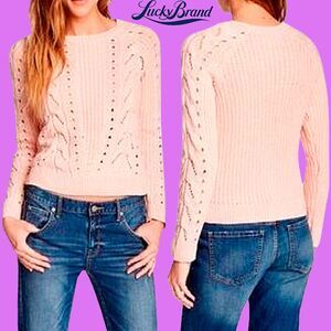 Lucky Brand |NEW| Cable Knit Crew Neck Pullover Sweater S. A beautiful cable knit design sweater charms with a flattering crew neck and a soft blush pink woven color. Crafted from a blend of cotton that is perfect. This well-made sweater is warm, cozy and a keeper. It is quality made by Lucky Brand. See pictures for all details and the measurements provided below/the Table Chart in the pics to size this sweater.