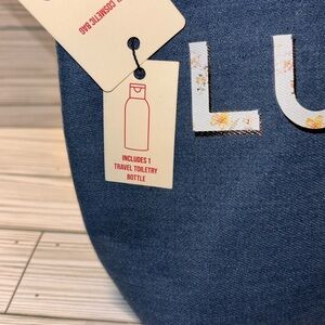 Stylish blue cosmetic bag. Features 'Lucky' text and clover design. Perfect for travel or daily use.