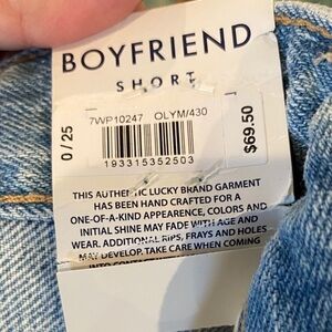 Lucky Brand NWT Boyfriend Shorts, Denim, Cuffed, Mid 9” Rise, Distressed Cutoffs, Size 0 (25). New With Tags. Waist measures approx 30”. Inseam measures approx 3.75”. Rise measures approx 9”. 100% Cotton fabric with no stretch. The logo patch has a little scratching from hanger clips, it’s not really very noticeable unless you are looking for it, see photo. Adorable shorts for warm weather with just the right amount of distressing. Retail $69.50.