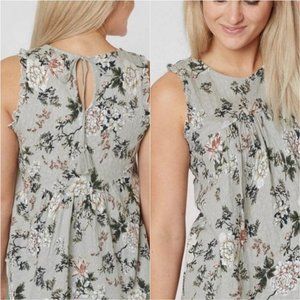 Lucky Brand Gray Jacquard Floral Sleeveless Dress NWT Super soft sleeveless gray dress with floral design made up of muted black, rust, and white colors. by Lucky Brand. Jacquard fabric, shirttail hem & ruffles at arm openings. Keyhole at back w/ tassel-end drawstring.
