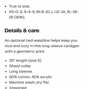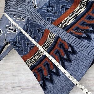 Per Lucky Brand, βAn optional tied waistline helps keep you nice and cozy in this long-sleeve shawl collar cardigan with a geometric printβ. Thick knit, but wool free for seasonless wear. Gorgeous cardigan! Size large. See photos for measurements.