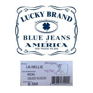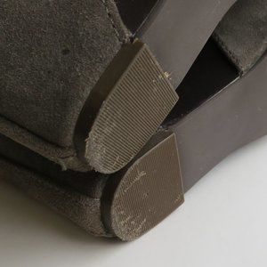 Fun wedge bootie (shootie) from Lucky Brand. The style is "Nellie" and the color is listed as Iron - Oiled Suede. It is almost a greyish taupe/tan to me. It is a lace-up, peep toe, with a cutout on either side as well. Has a rubbery sole, with minor wear on the heel and that's about it. A very nice neutral that would go with just about anything!