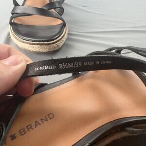 Lucky Brand Nemelli espadrille sandals in black leather with strappy upper and adjustable buckle ankle closure. Round open toe with jute-wrapped flatform/wedge, stacked wood-style midsole, and textured rubber lug outsole for grip. Uppers in excellent shape with only minor sole wear. Perfect for summer vacations, beach outings, and boho-chic festival looks.