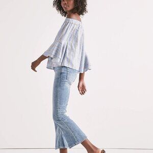 NWOT Lucky Brand off shoulder pinstripe top with the style number 7W4484 is officially listed on the Lucky Brand website as the "Off Shoulder Stripe Top". This off-shoulder top features a tiered flutter sleeve and a multi-color stripe fabric.