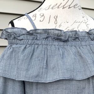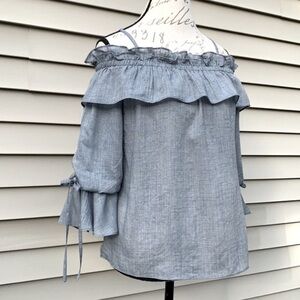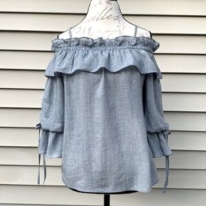 Super soft blue and white linen look gets reimagined in this off the shoulder top. Features ruffles around the top, gathered sleeves that tie leading into a flowy bell cuff. Complete with adjustable spaghetti straps. This is the flirty upgrade your wardrobe has been dying for.