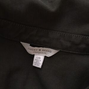 This Lucky Brand olive green jumpsuit is a versatile one-piece outfit perfect for travel or casual wear. It features a collared neckline, short sleeves, and a button closure for easy wearing. Made from medium weight rayon fabric, this jumpsuit has a solid pattern and comes in size L. The garment care instructions indicate that it is machine washable, making it convenient for everyday use. With a regular fit and pockets for added functionality, this jumpsuit combines comfort and style.
