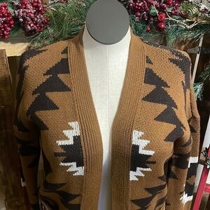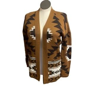 Lucky Brand Open Front Aztec Design Southwestern long Cardigan sweater Brown Sm
