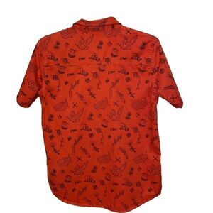 Short sleeve, orange, cotton blend button down shirt by Lucky Brand in a size Large. The print consists of line drawings of various Americana trucker objects including: cheeseburgers, eagle, tires, wrench, truck. Front chest pocket. Machine washable. Approximate measurements shown in photos. In great pre-owned condition.