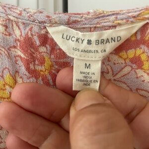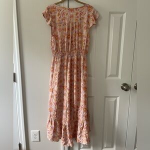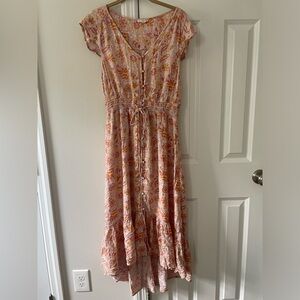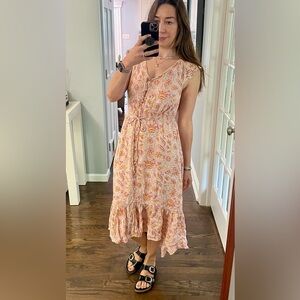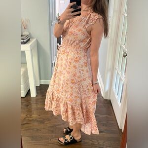 Lucky Brand Paisley Midi Boho Dress. Pink and yellow floral paisley print. Size medium. Lined. Elastic drawstring waist. High low style. No pockets. Excellent condition, worn once.