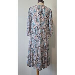 Lucky Brand Paisley Print White Teal 3/4" Sleeves V Neck Lined Midi Dress Sz Small