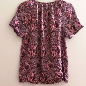 This blouse in a size M is gently used with no visible signs of wear. A lovely blend of plum, pink and ivory with tassels on both sides of the v neckline.