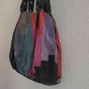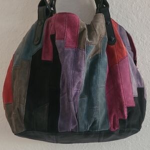 Eye-catching Suede shoulder tote bag with a colorful patchwork design. Features a mix of vibrant hues. Ideal for adding flair to any outfit. Large main zipper closure. Interior is Black Cotton in Good shape with a zipper pocket. 2 side Pouch pockets. Thick Black leather Straps. 9.5 inch Drop. Thick Black Leather Bottom. Bag is in Good pre owned condition and Well loved. Allover wear and fading. No Holes or rips. Boho Vintage Condition. Western Rodeo Line Dance Festival Gypsy Rock Star.