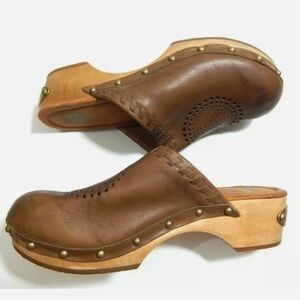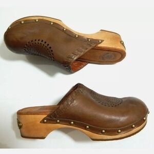 Item: Women's Vintage Y2K Wood Sole Clogs Mules Leather Peace Sign