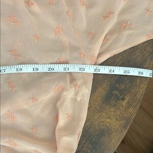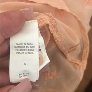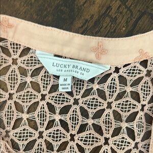 This stylish blouse from Lucky Brand features a boxy silhouette with a mandarin collar and three-quarter length sleeves. The vibrant orange and pink hues add a pop of color, while the intricate lace detailing across the chest enhances its elegant appeal.