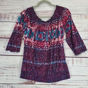 Lucky Brand Peasant Blousy Top Size M Purple Blue Paisley Geo Stretchy Boho 70's
