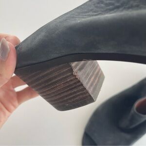 Good used condition. Texture and slight color variation is characteristic of material, not a flaw. Some rub marks on heel and outsole. Scuffs and wear to stacked heel, see pictures and video.