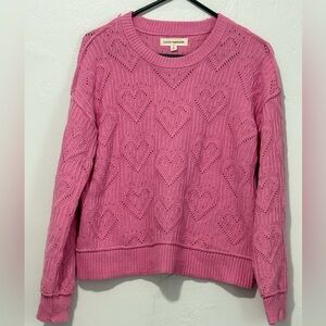 Charming pink sweater with heart knit design. Soft and cozy for any occasion.