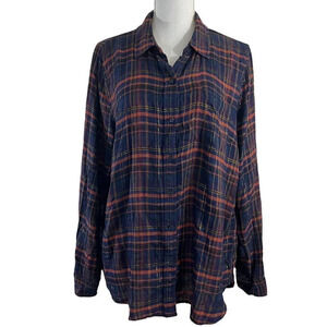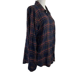 Lucky Brand Plaid Button Up Blouse Navy Blue Orange and Gold Large.
