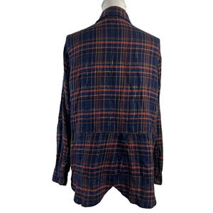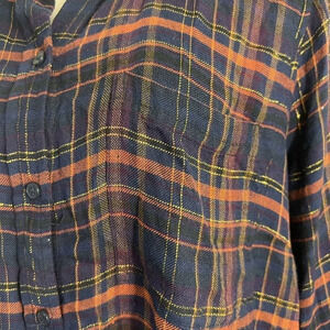 Lucky Brand Plaid Button Up Blouse Navy Blue Orange and Gold Large