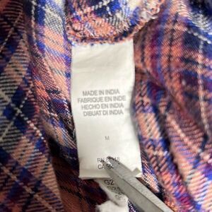 This Lucky Brand plaid button-down shirt is a stylish and unique piece! It features a classic plaid pattern in a versatile color palette of purple, pink, black, and white, making it perfect for both casual and dressed-up looks.