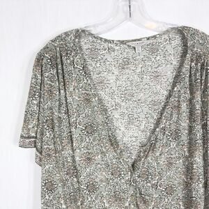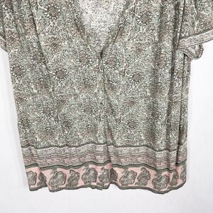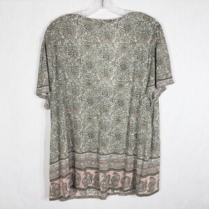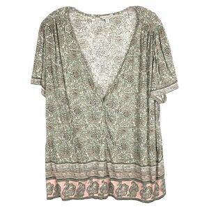 Lucky Brand Plus Size 1X Top Green Tan V Neck Short Sleeve Floral Knit Pearl 687