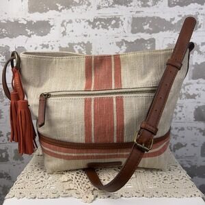 Lucky Brand Purse Linen Blend Natural Coral Stripe Shoulder Bag Suede Tassels
