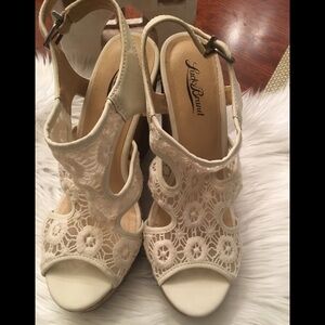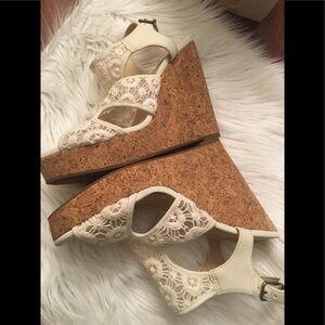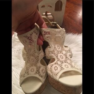 Womens Lucky Brand Ranette Wedge Sandals White in excellent condition, worn a few times, open toe wedge. A cream/white crochet floral lace, 5” tall cork wedge. Size 8M, no trades