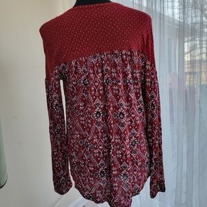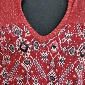 Lucky Brand red Aztec vneck tunic. Long sleeve, elastic cuff. Measures flat 18.25 underarm seam to seam. Length measures 24" in front and 26" in back shoulder to hem. Sleeve measures 24.5" shoulder to cuff. Stretchy cotton/modal Size S/P.