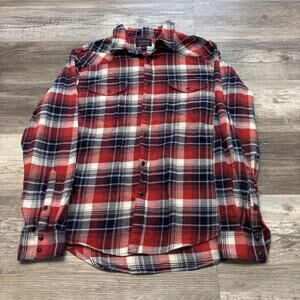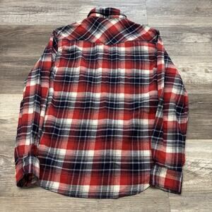 Lucky Brand Red Blue Mens L Saturday Stretch Plaid Flannel Pearl Snap Shirt