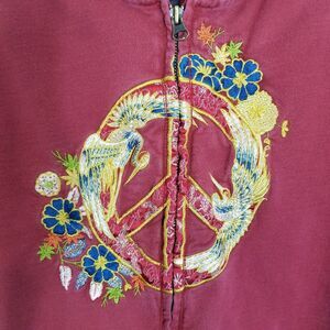 Stylish red hoodie with embroidered peace sign. Features floral accents. Comfortable and casual design.
