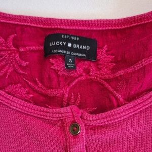 Knit top with sleeve length right above elbow. Reddish pink color, knit has fading through out. Beautiful embroidery around shoulders and top back of blouse. Size small buttons in front. Round neckline .