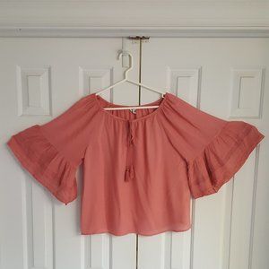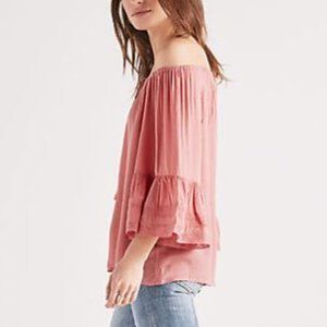 Lucky Brand Bell Sleeve Peasant Top in rose color with eyelet lace accents. Can be worn off-the-shoulder or as is. Perfect for the upcoming spring & summer seasons.