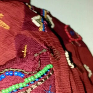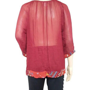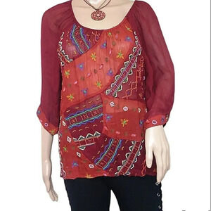 Lucky Brand Sheer Beaded Embroidered Boho Rust Red Cobalt Blue Mustard Yellow Peasant Floral Blouse