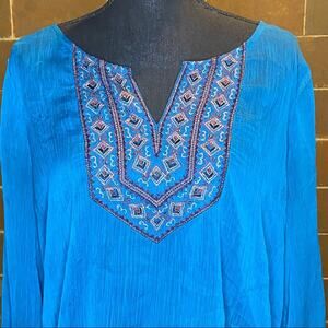 Lucky Brand Semi-Sheer Beaded Embellished Blouse Top Career Women's L Large. Popover Style. Split Neck. Balloon Sleeves. Blue-Green. Measurements in Pics. EUC.