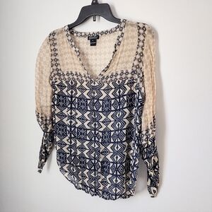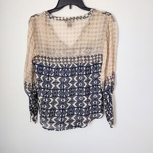 V-Neck top features ruched sleeves with tie. Sheer, light and flowy.