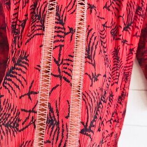 Really cute coral & navy chiffon floral/leaf print blouse. Scalloped stitched hem with embroidered peek a boo front detail. Great for any occasion!
