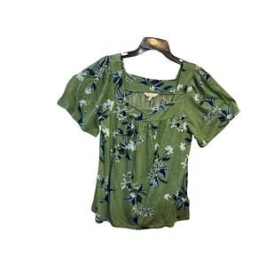 Lucky Brand Shirt Green & Blue Floral Print Square Neck Flutter Sleeve Sz Medium