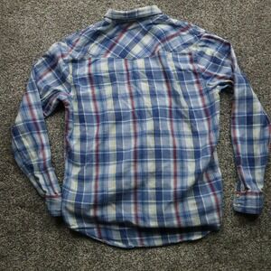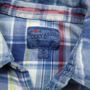 Keywords: Lucky Brand shirt, mens plaid shirt, western shirt, button up shirt, casual shirt, long sleeve shirt, mens medium shirt, blue plaid shirt, red plaid shirt, cotton shirt, mens clothing, plaid button down, western wear, country style