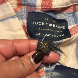 Lucky Brand, plaid pattern, long sleeves collared neckline button down shirt. The button-down closure and cotton blend material make it very comfortable.