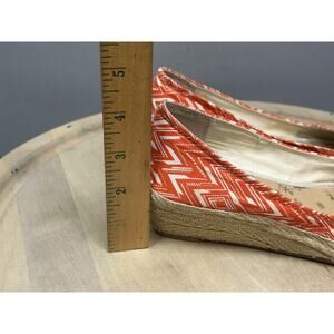 Features: Bold orange and white geometric zigzag pattern on canvas upper. Espadrille-style braided jute wedge platform. Slip-on style for easy wear. Wedge heel measures approximately 2 inches tall.