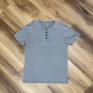 Casual and comfortable gray Henley tee. Features short sleeves and button detail. Ideal for everyday wear.