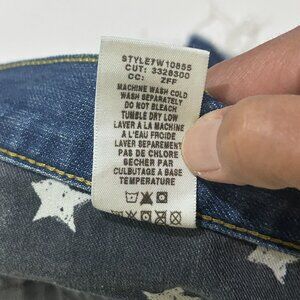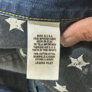 Legend Riley style - heavily distressed, with peace sign embroidery on the front and star/flag theme pocket linings
