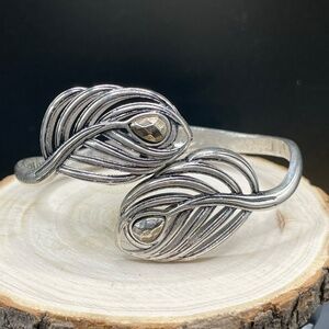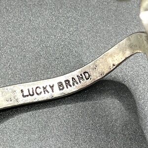 Lucky Brand signed silver tone bypass hinged leaf design bracelet. Two center leaf shapes bypass each other on this hinged bracelet. Hinge is strong. The teardrop shapes at the top of the leaves are a gold tone color --NOTE: one is worn. Fits a 7" wrist. Pre-owned. The 2 leaves in the center together are about 1 1/2" wide.