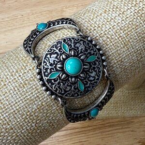 This intricately designed Lucky Brand bracelet features a silver-tone finish with turquoise accents. Its durable toggle clasp ensures ease of wear and security.